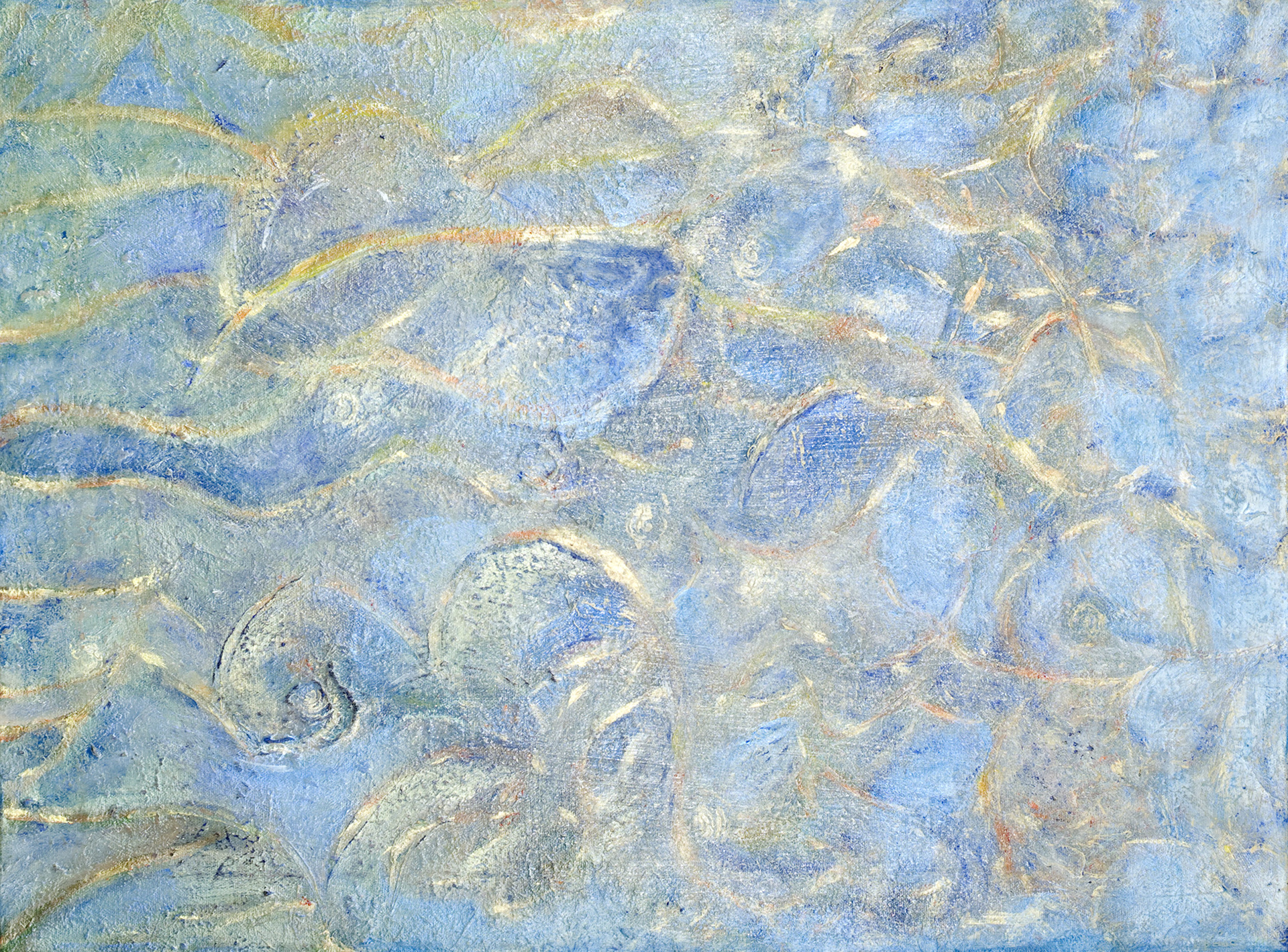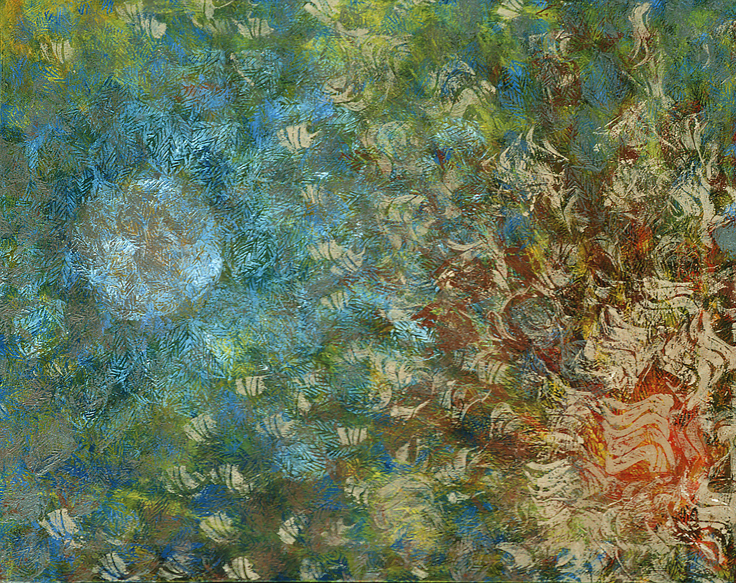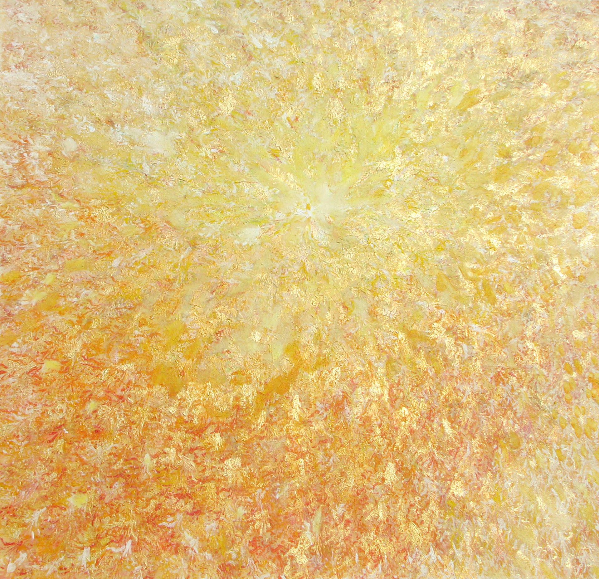 "Fire is a powerful force of dynamic change. Some pinecones need the intense heat of a forest fire to burst open and change into a new form. The phrase ‘trial by fire,’ acknowledges that events sear and change us. Yet the force of transformative experiences can also change and heal us. This is how I understand fire as a force for sacred transformation in my life. My searing experiences are brought in, and as I paint, I wrestle with allowing myself to open to new understanding, and let the process teach me. The painting records this journey. My work reflects the passage from difficulty, to joy and understanding, to a presence of peace, to dancing with quiet joy — like fire."